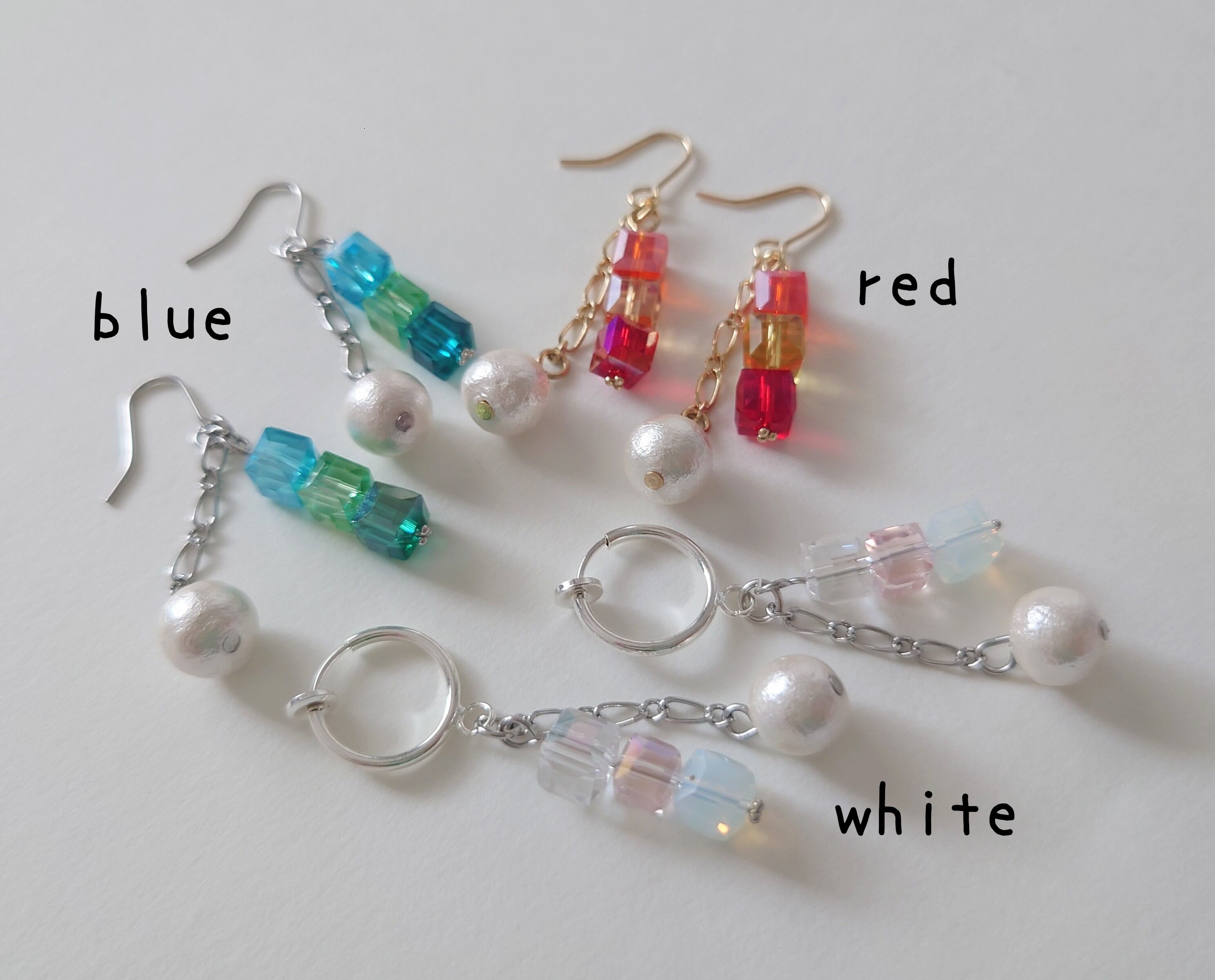 イヤリングは、blue/whiteはシルバーカラー、redはゴールドカラーとなります。