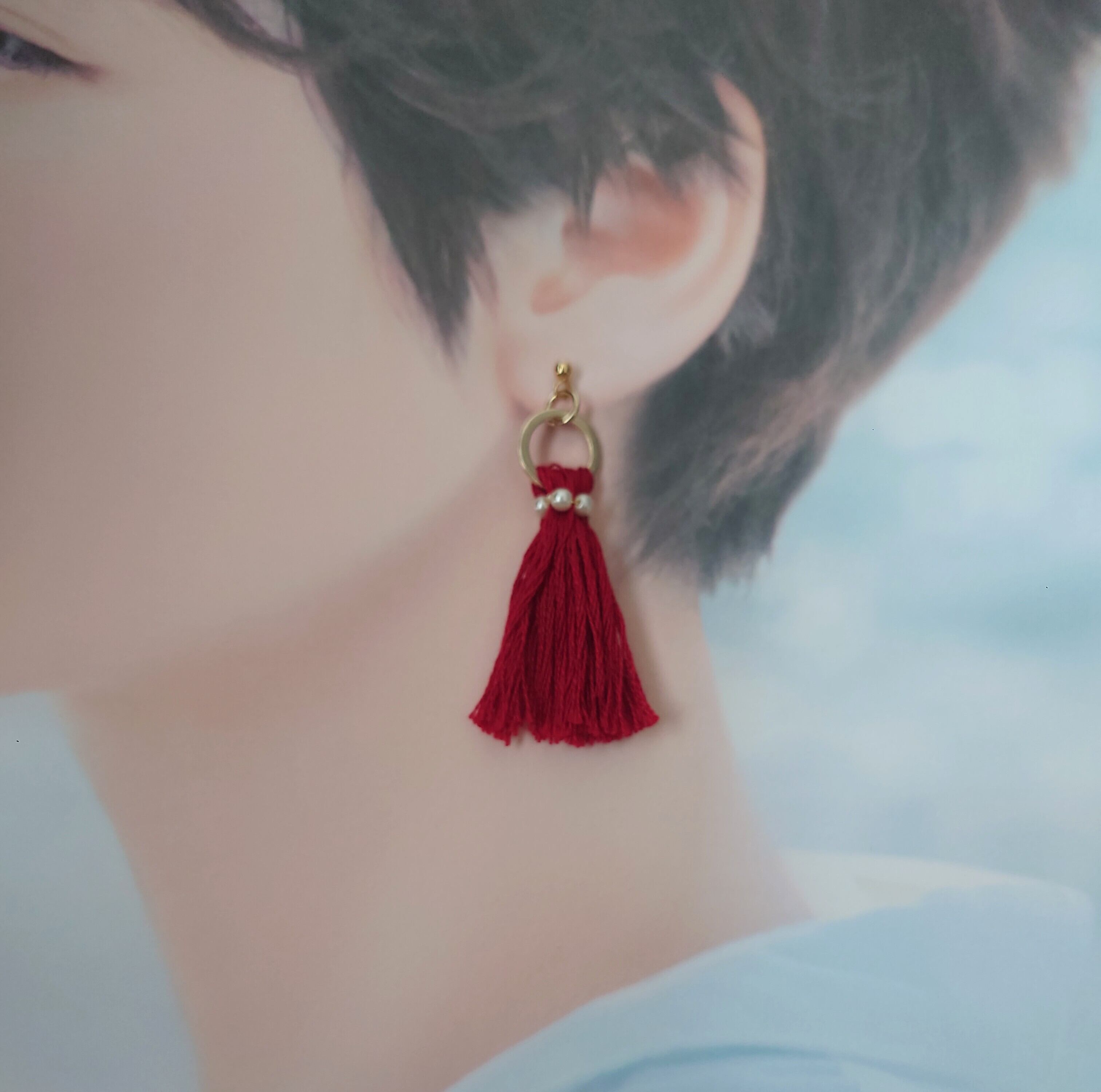 落ち着いた濃赤と濃青の刺繍糸をフリンジに。