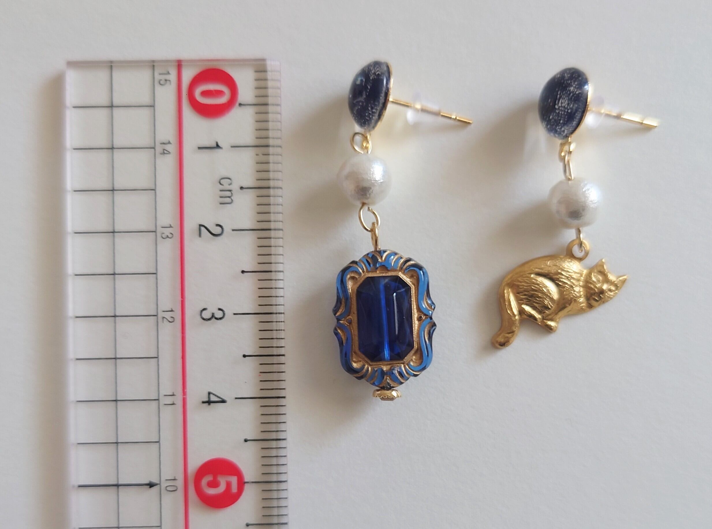レトロな額縁を思わせるドイツ製アクリルパーツと真鍮製のネコチャームのアシンメトリーなピアス・ノンホールピアスです。